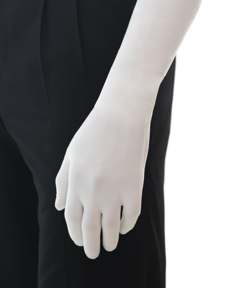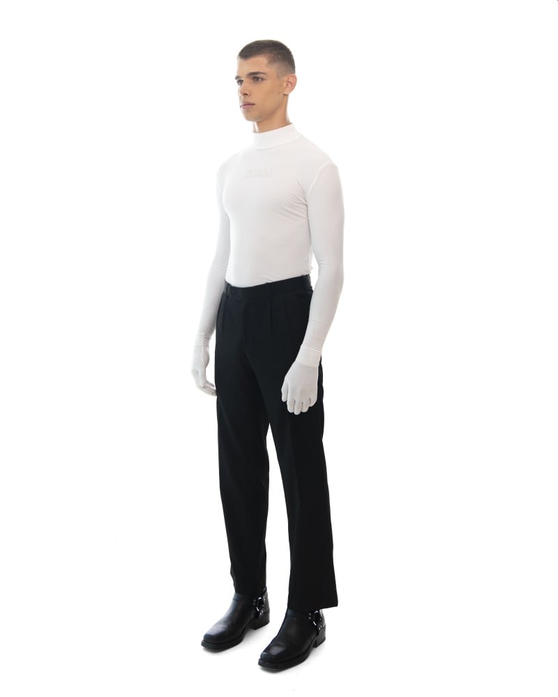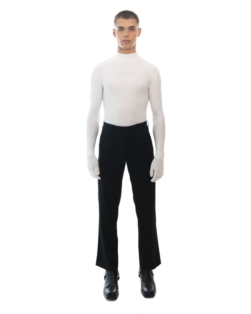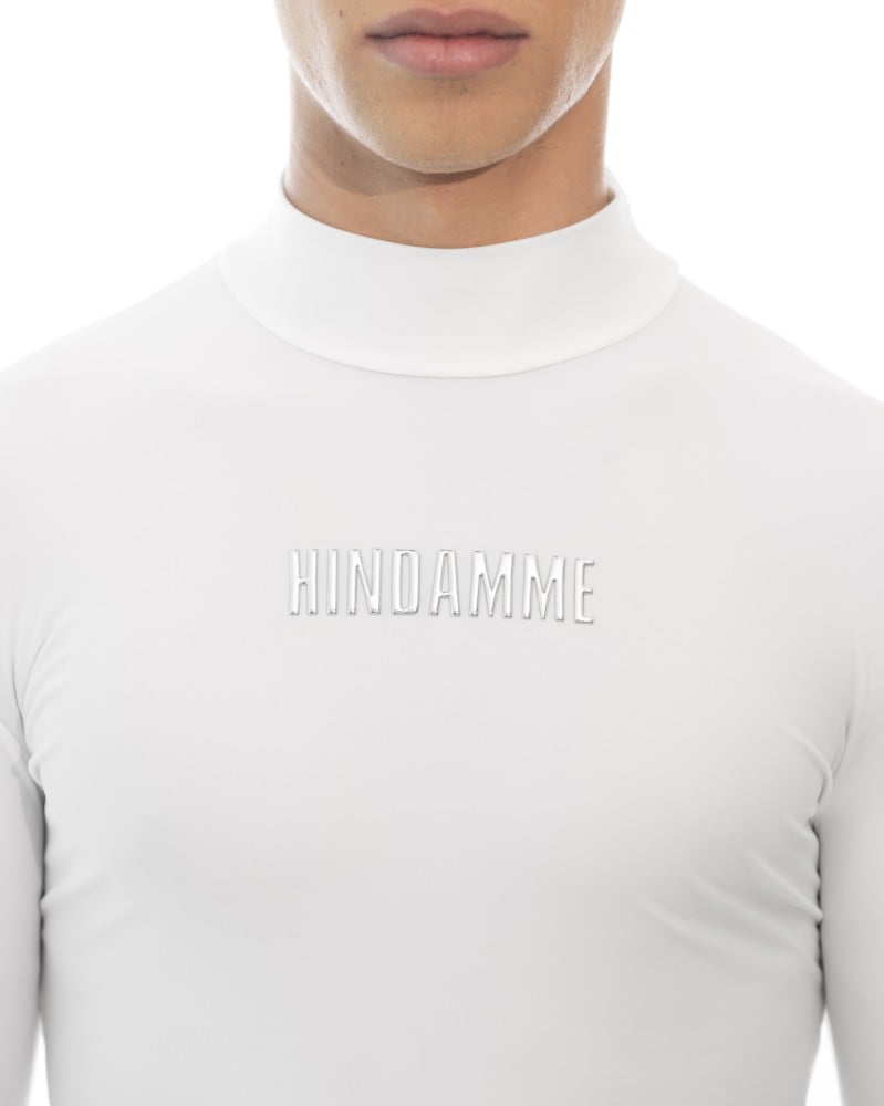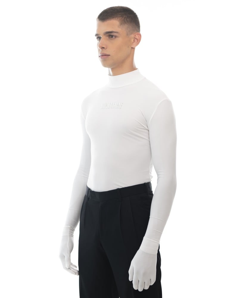 Long sleeve turtle neck second skin with removable gloves in Off White and featuring metallic logo. Men's Style.